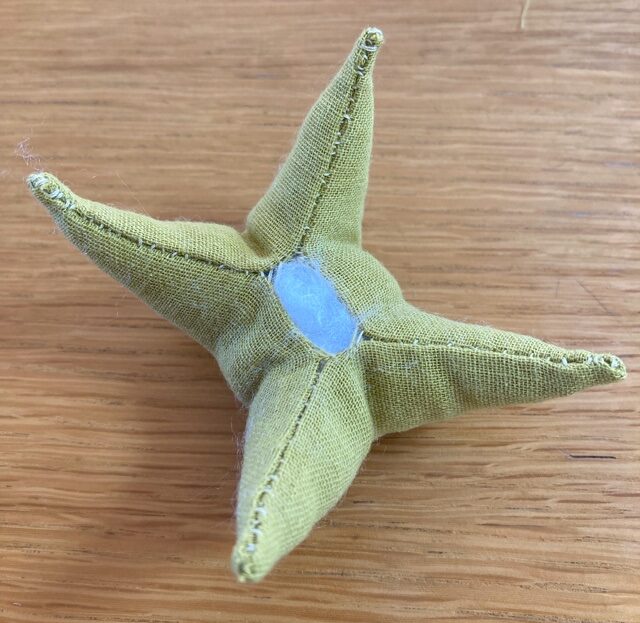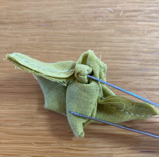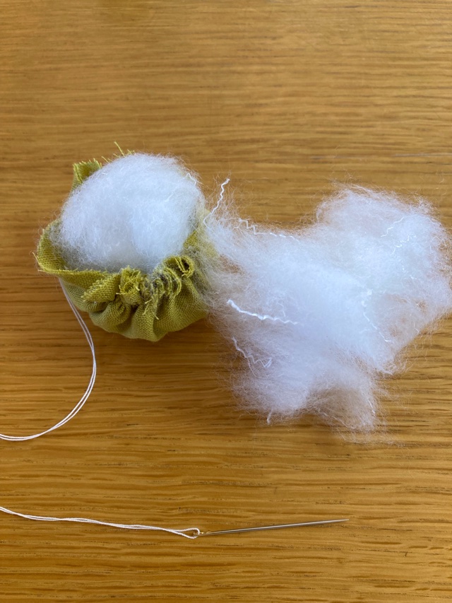 3、針と糸はついたままにしておきます。わたを内側に詰めていきます。