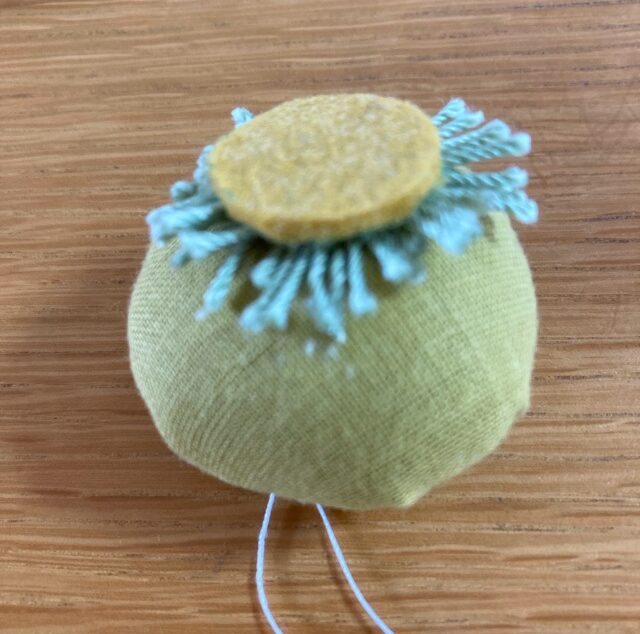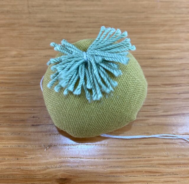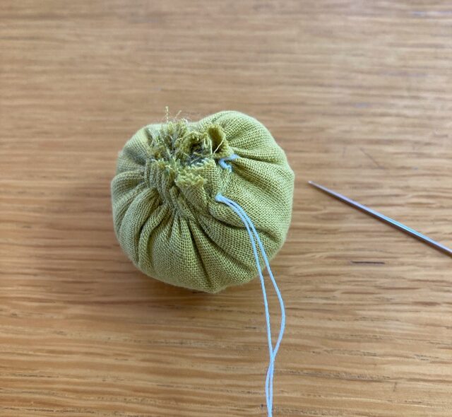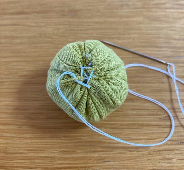 4、ぎゅーっと糸を引きます。上の画像はわたが少ないので、さらに詰めました。丸く、パンパンな感じがかわいいのでできるだけ詰めます。