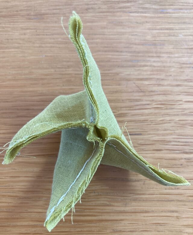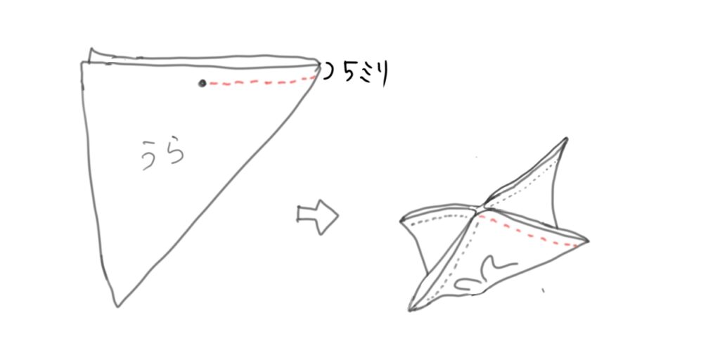 2、三角をたたみ直して、同様に端から⚫️点の位置まで縫う。4つの角を同様に縫ったら、下の絵のようになります。