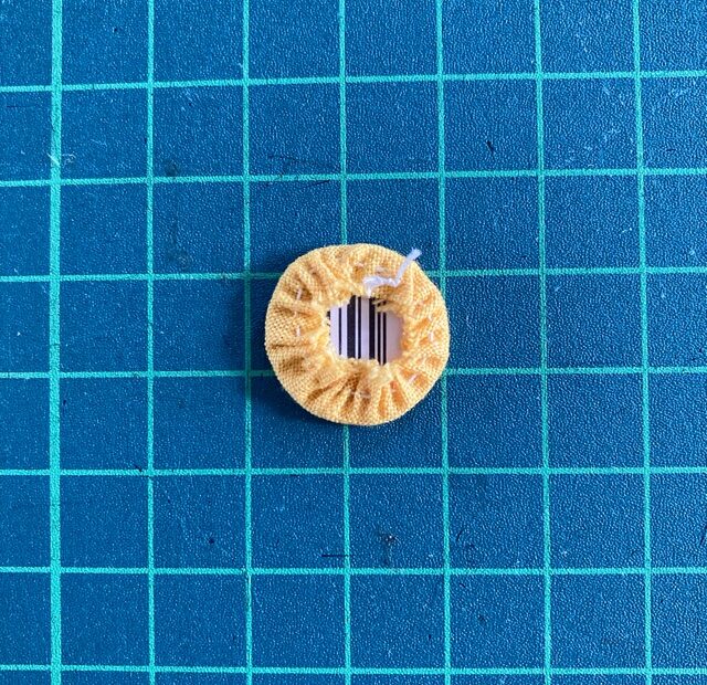 9、お皿用台紙(直径2センチ)を用意します。ティッシュの箱とかの薄手のボール紙で。白無地でなくても布で包むので大丈です