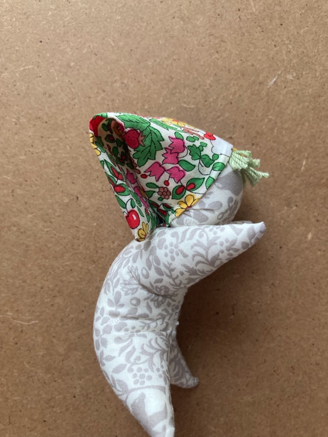 写真のように頭巾の端を折って縫い付けます。(軽く中央部分だけでいいです)