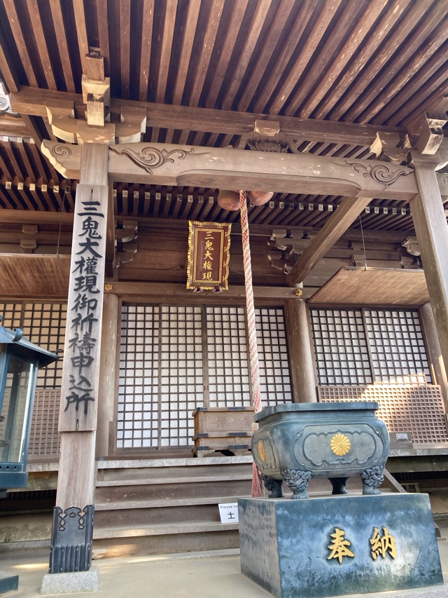 三鬼大権現さまとは、大同元年(806年)に弘法大師空海さまが弥山にて修行された折、宮島弥山、またご自身の守護神としてご勧請された鬼神様です。その名の通り、三体の鬼神様からなり、それぞれ時媚鬼神(じびきじん)、追帳鬼神(ついちょうきじん)、摩羅鬼神(まらきじん)と呼ばれます。神仏習合を強く体現した鬼神様でもあり、その本来のお姿は大日如来、不動明王、虚空蔵菩薩の三体であると云われています。