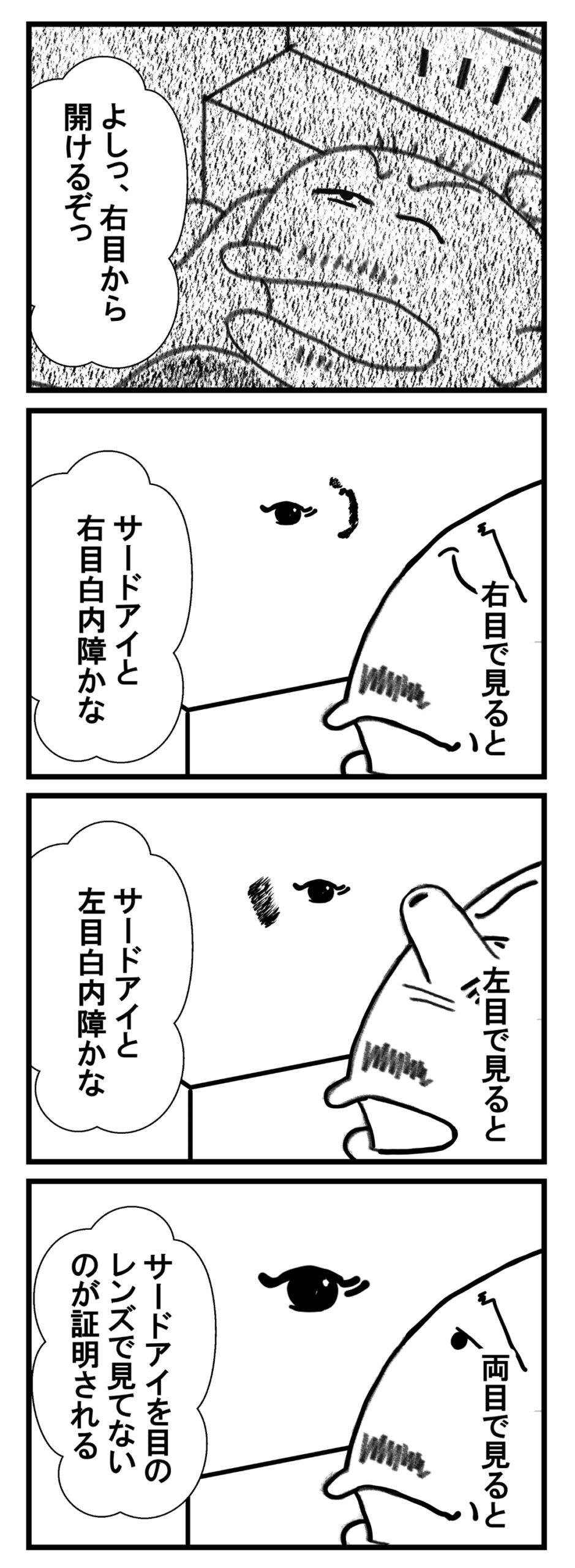 八十九2025.12.03てっ、緑内障だよね・・・じゃないよね ポスト シェア はてブ 送る Pocket 八十九です 片目づつ欠損部が違う形で見えますが、 サードアイはどちらの目で見ても「しれっと」そこに居ます。 白内障じゃないですよね!緑内障でしょう!!